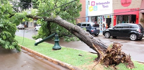 Nem choveu tanto assim, mas o temporal fez estragos em Campo Mourão na tarde desta segunda-feira. As árvores públicas que o digam. Na rua Francisco Albuquerque teve até uma que caiu em cima de um Saveiro. Na av. Manoel Mendes de Camargo, a árvore levou junto um poste republicano, sem contar que fechou a via. Ah, São Pedro!...