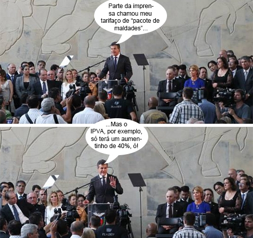 Os cliques são desta quinta-feira, quando o governador Beto Richa foi empossado para o segundo mandato à frente do Palácio Iguaçu. Na hora do discurso, não faltaram críticas ao governo federal, mas nem um pio sobre o tarifaço aprovado em dezembro. Ah, coisa do governo passado...