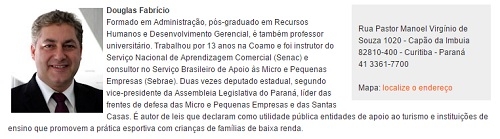 Diz o texto que ele é autor de leis que declaram como utilidade pública entidades de apoio ao turismo e instituições de ensino que promovem a prática esportiva com crianças de famílias de baixa renda.