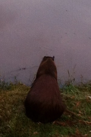 Capivara solitária "pensando na vida" no Parque do Lago de Campo Mourão. Maria Alves