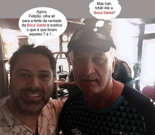 O clic é desta segunda-feira, quando o mourãoense Fábio Danielli, de férias pelo Rio Grande do Sul, acabou se encontrando com o técnico Luiz Felipe Scolari. Atual treinador do Grêmio, Felipão treinou o Brasil em duas copas do mundo. Na primeira, em 2002, foi campeão em cima da Alemanha. Na segunda, em 2014, levou de 7 a 1 dos alemães. Ô alemãozada vingativa, sô!...