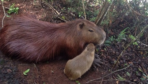 Filhote de capivara parece estar dando beijo no rosto da mãe, em cena flagrada no Parque do Lago de Campo Mourão. Cirineu