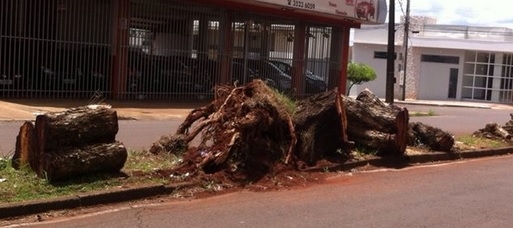 Os restos da árvore que caiu na av. Goioerê, dia 31 de dezembro, seguem pela calçada e pelo canteiro central.