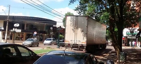 Olha o caminhão baú, trucado, passando pelo centro de Campo Mourão. A foto é da avenida Manoel Mendes de Camargo, no cruzamento com a rua Harrison José Borges.