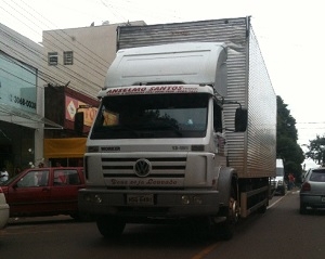 Quarta-feira da semana passada, às 15h40, caminhão baú passa pela na rua Brasil, na quadra da prefeitura de Campo Mourão. Hélber