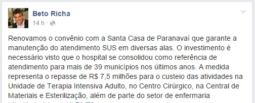 Nesta quarta-feira, por exemplo, Richa postou que o governo renovou convênio com a Santa Casa.
