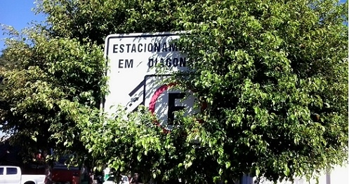 "O clic é na esquina da av. Capitão Indio Bandeira com a rua Interventor Manoel Ribas e mostra a placa coberta pela árvore com as mínimas condições de visibilidade. Sinal do descaso com a sinalização de trânsito em Campo Mourão". Greyson Antonio Pires