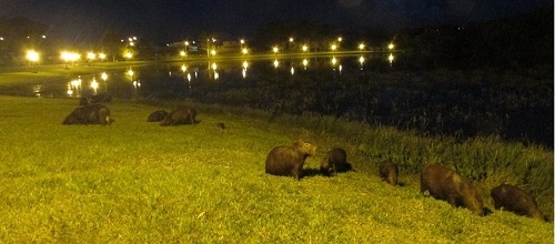 Grupo de capivaras passeia à noite no Parque do Lago, em Campo Mourão. Durante o passeio surgem umas sugerinhas, é claro, mas o parque é delas. Tá tudo dominado!...