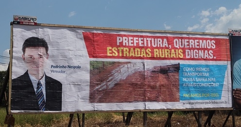 O presidente da Câmara, Pedrinho Nespolo, espalhou outdoors pela cidade com críticas à administração municipal. Neste aí, perto da rodoviária, a cobrança é com relação ao estado das estradas rurais. Pelos corredores da prefeitura, os outdoors foram ironizados, já que a Câmara teve R$ 1,2 milhão de sobras e preferiu reservar o dinheiro para criação da TV Legislativa.