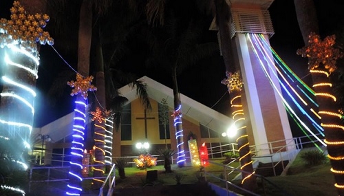 As luzes de Natal já foram acesas em Nova Cantu. O clic é da praça da igreja matriz, o principal cartão-postal da cidade nesta época do ano.