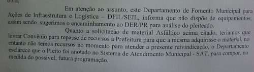 O documento diz que o recape deve ser pedido ao DER e que não há recursos para a massa, mas que o pedido foi anotado para uma "futura programação".
