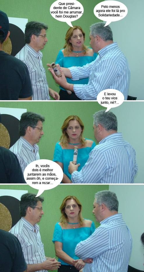 Os cliques são desta sexta-feira pela amanhã. A reunião para discutir o Cis-Comcam perto da Santa Casa acabou e a prefeita Regina Dubay, o deputado Douglas Fabrício e o presidente do hospital, Luiz Marcos Mancebo Campos, aproveitaram para colocar a conversa em dia. Um mosquitinho que passou por ali disse que eles estavam falando sobre repasses atrasados do Estado para a Santa Casa. Hummmmmmm, ops, zzzzzzz...