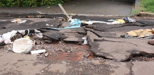 Não bastassem os buracos "tradicionais", olha só o que a chuva fez na rua Santa Cruz, entre as ruas Belém e Curitiba, na região dos jardins Kennedy e Horizonte. A enxurrada entrou por baixo e arrebentou tudo. Desceu tanta água que um muro foi arrebentado pela enxurrada e uma casa chegou a ser alagada. Toc, toc, toc!...