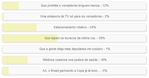 A opção "Que a prefeita e os vereadores briguem menos" terminou em quarto, com 12%.
