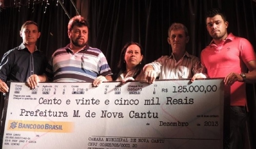 A Câmara de Nova Cantu R$ 125 mil à prefeitura. O dinheiro é fruto da economia feita ao longo de 2013 pelos vereadores. O prefeito Airton Agnolin recebeu a bolada do presidente da Câmara, Tiago Elicker Raymundo. O dinheiro será usado para reforma da rodoviária e na readequação de estradas. Agnolin elogios os "nobres edis" e ressaltou o bom relacionamento entre os dois poderes. “Vamos manter esse diálogo”, frisou. E viva o checão!...