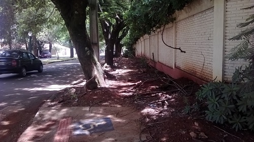 "Na av. Jorge Walter, a uma quadra do Colégio Estadual, existe esta "calçada". Repare que existe até rampa de acesso para cadeirantes... Só trafega ali o cadeirante equipado com pneus de trator... A única forma de se caminhar é pela lateral da rua, dividindo espaço com os carros... Agora, imaginem quantos estudantes andam por ali em período letivo?" Anderson Marcondes