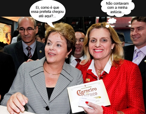 Demorou um pouquinho, mas saiu a “foto oficial” do encontro da prefeita Regina Dubay com a presidenta Dilma Rousseff, quinta-feira passada, em Pinhais. Foi durante evento promovido pelo PT. Regina passou pela segurança e entregou o convite para a 23ª Festa Nacional do Carneiro no Buraco. Tá pensando o quê!...
