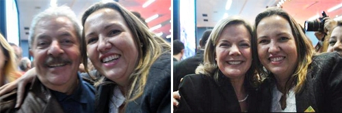 A deputada Marla Tureck também participou, quinta-feira, do evento em Pinhais que comemorou os 10 anos do PT no comando do País. Não faltou a tradicional foto junto com o ex-presidente Lula. De “rostinho colado” e tudo. Marla também fez pose ao lado da ministra Gleisi Hoffmann. Ah, deixa o Beto Richa ver isso, deixa...