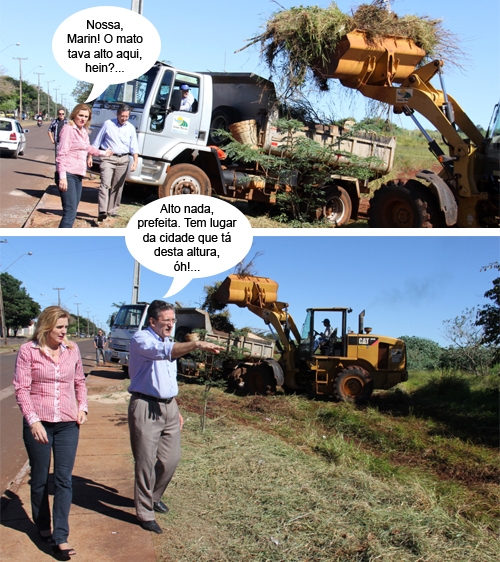 A prefeita Regina Dubay e o secretário José Marin (Obras) foram acompanhar nesta segunda-feira os trabalhos de corte de grama, roçada, limpeza de terrenos e tapa-buracos na Asa Leste. São as ações do programa Prefeitura no Bairro, que segue até sexta-feira. A abertura do módulo acontece nesta terça-feira (19h30) na lona armada na Praça do Japão. Só não vá confundir o Circo di Sarah com o “Circo di Regina”...
