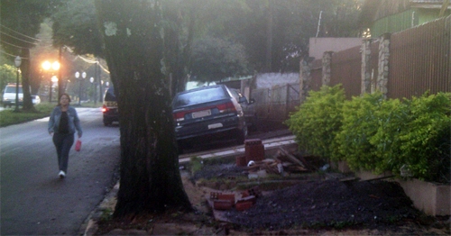 "Viva a liberdade de ir e vir!". Calçada vira garagem e espaço de obras de construção. Av. Jorge Walter”. Carlos
