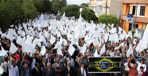 Milhares de pessoas participaram neste sábado pela manhã, em Campo Mourão, da Marcha para Jesus. O evento foi realizado simultaneamente em mais de 130 cidades do Paraná. Durante a marcha, organizada pela Opecam, as pessoas caminharam pelo centro da cidade louvando ao senhor e glorificando o amor de Deus em família. A foto é da assessoria da deputada Marla Tureck, que participou do evento.