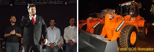Nova Cantu – Você já viu prefeito usar terno e gravata para a entrega de pá-carregadeira? Pois então veja! O prefeito Airton Agnolina ficou assim, todo pomposo, para a entrega das três máquinas compradas pela prefeitura. Elas custaram R$ 966 mil. O evento incluiu show na praça com Jair Supercap Show. Tá pensando o quê!...
