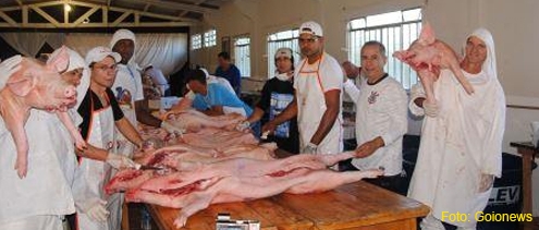 O prefeito Beto Costa foi acompanhar o “desossamento” dos leitões.