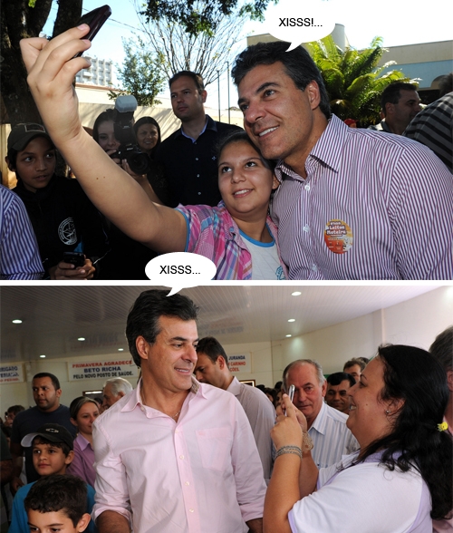 Não é fácil essa vida de “governador-galã”. Ainda mais hoje em dia, que todo mundo carrega uma câmera fotográfica dentro do celular. Nas “chapas” acima, Beto Richa faz pose para fotos de celulares em Mamborê e em Juranda. Também, governador não é príncipe, mas trabalha num palácio...