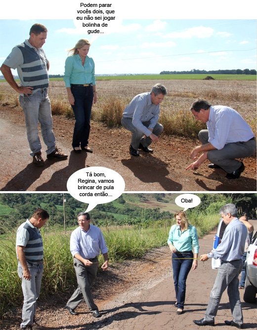 A visita foi a pedido da prefeita Regina Dubay, que andou falando até em retirar o asfalto e colocar cascalho na estrada, de tão ruim que está aquilo.