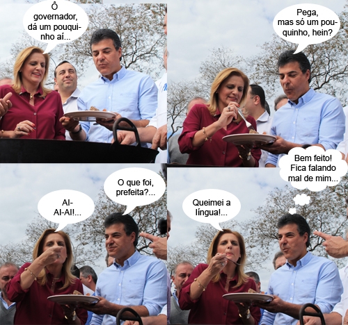 Os cliques dão da hora da retirada do tacho “número um” da 23ª Festa Nacional do Carneiro no Buraco. O governador Beto Richa foi cavalheiro e pediu que a prefeita Regina Dubay desse a primeira beliscadinha na iguaria. Regina recusou. Disse que Richa era o convidado especial. E assim foi feito. Só que o governador dividiu os primeiros pedaços com a prefeita. Agora, cá pra nós: pela cara deles, ou tava salgado demais ou queiram a língua mesmo...
