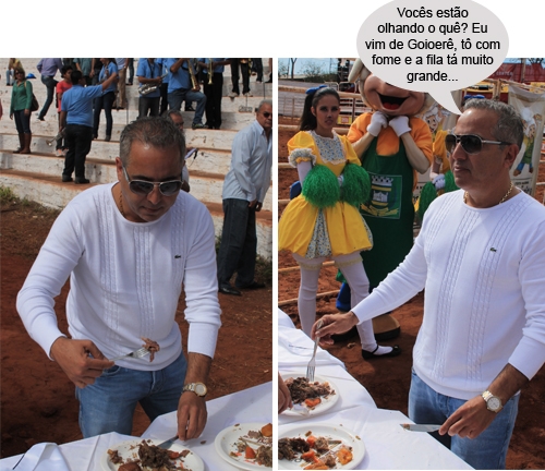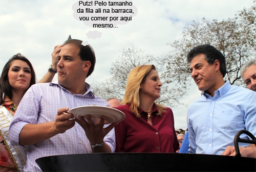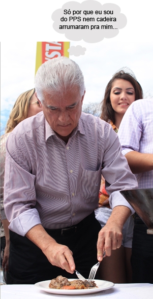 Calma, gente! O deputado federal Rubens Bueno não precisou almoçar em pé, não. O clic é da degustação realizada ao lado do tacho “número um” e por ali todo mundo ficou em pé mesmo. Bueno almoçou confortavelmente, ao lado do governador Beto Richa, na barraca do Sindicato Rural.