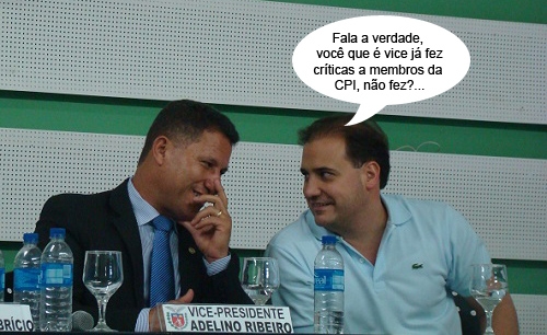 O clic é de quinta-feira, na audiência da CPI do Pedágio. O vice-prefeito Rodrigo Salvadori deu uma passada por lá e sentou ao lado do vice-presidente da comissão, deputado Adelino Ribeiro. Foi a volta de Salvadori à Acicam, depois de ter participado de reunião da Acicam e feito críticas ao coordenador geral Carlos Garcia. No mais, vice com vice se entende, não se entende?...