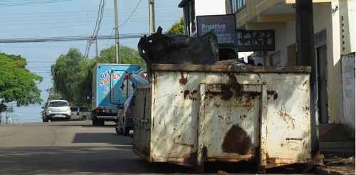 Esta caçamba está há meses e meses na rua Santos Dumont, entre as avenidas Goioerê e Manoel Mendes de Camargo. Isto pode, Arnaldo? Um perigo.