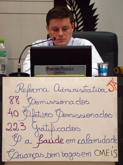 Pedrinho Nespolo colocou em frente sua bancada, no plenário da Câmara, um cartaz pedindo “reforma administrativa já”.