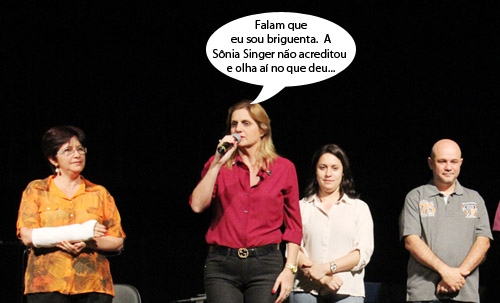 O clic é de sexta-feira, no Teatro Municipal, onde aconteceu a cerimônia de encerramento do 12o Festival de Teatro de Campo Mourão. A prefeita Regina Dubay discursa ao lado da secretária Sonia Singer (Cultura), da diretora Samantha Andrade e do diretor de teatro Chico Pinheiro. E que fique claro: o braço engessado de Sônia não foi briga, tá?...