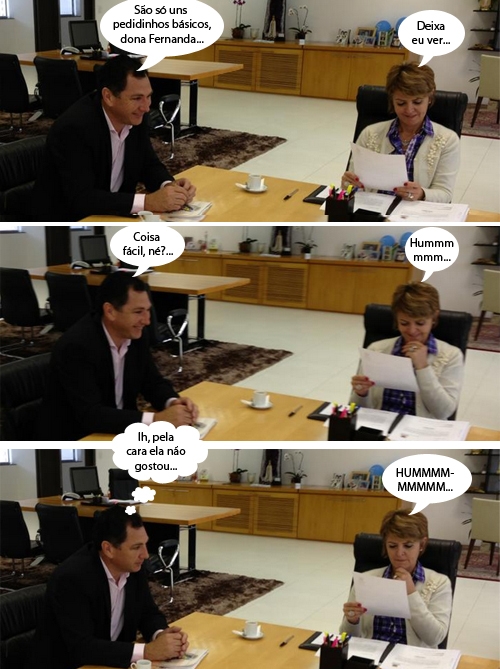 Os cliques são de Curitiba, onde o prefeito de Mamborê, Nei Calori, esteve esta semana com a secretária de Estado Fernanda Richa (Desenvolvimento Social), que também é a primeira-dama do Paraná. Aliás, Calori foi com a primeira-dama de Mamborê, Vânia Maria. E levou uma listinha de pedidos. Sabe-se lá o que estava escrito ali, mas que a mulher do governador ficou pensativa, ficou...