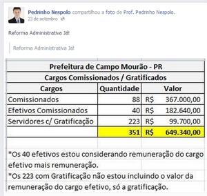 O presidente da Câmara, Pedrinho Nespolo, retirou do Facebook as postagens que mostravam os salários de cargos comissionados da prefeitura e da Câmara.