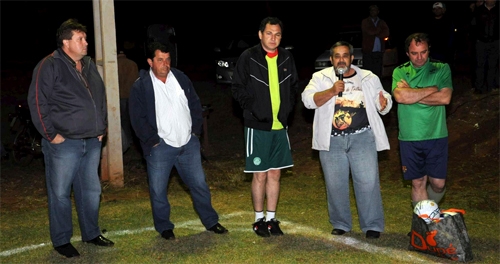 O prefeito de Mamborê, Nei Calori, foi à comunidade do Canjarana fazer a entrega oficial de um campo de futebol suíço. Os recursos são do Ministério do Esporte, em parceria com a prefeitura. Três vereadores também estiveram por lá. Após os discursos de praxe aconteceu uma partida de futebol, com Calori em campo e tudo. Agora, cá pra nós, pela posição do prefeito ali no centro a foto, ele estava com frio ou não?...