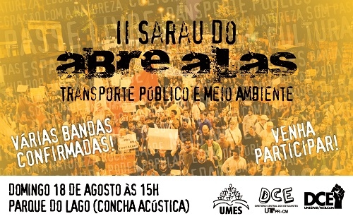 Dois eventos marcarão o final de semana em Campo Mourão. Um deles é o Festival de Inverno da UTFPR, que contará com música, teatro, recital de poesias, oficinas e debates. No domingo o evento será levado para o Parque do Lago. Será o 2º Sarau do Movimento Abre Alas. O espaço será aproveitado para o debate de questões como o transporte público (em especial o Passe Livre) e o meio ambiente (principalmente a situação do próprio Parque do Lago). Hummmmm...