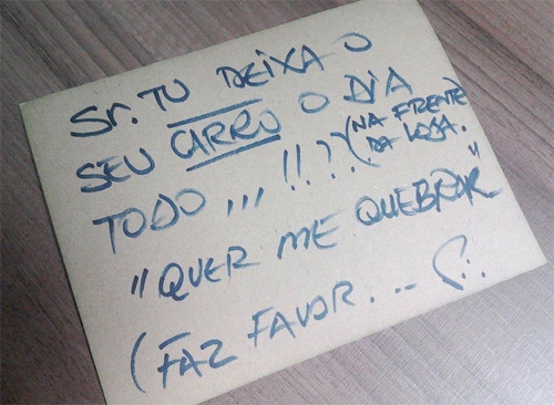 Olha só o bilhetinho que um motorista de Campo Mourão encontrou em seu carro, no centro da cidade. O comerciante reclama que o veículo fica muito tempo estacionado em frente a sua loja. O motorista achou o recado inusitado, fez o clic e mandou pra gente.