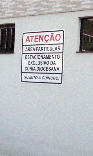 Parece que a falta de vagas pra estacionar tirou a paciência até da igreja. Em frente à Cúria Diocesana de Campo Mourão, na rua Harrison José Borges, foi colocada uma placa pra deixar bem claro que a área é particular e que só o pessoal da Cúria pode estacionar por ali. “Sujeito a guincho!”, avisa a placa. É, Deus perdoa, mas paciência tem limite...