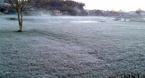 Segundo o Instituto Simepar, -1,5ºC em Campo Mourão na manhã desta quarta-feira. Olha o Parque do Lago como é que ficou branco da geada. Detalhe: a foto foi feita pelo vereador Edson Battilani. A previsão diz que vai esquentar a partir de agora. Pudera, né? Já estamos quase em setembro...