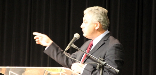 Eder Stela, diretor da Fecilcam, ao discursar no evento em que foi empossado oficialmente; nesta quinta-feira, no Teatro Municipal.
