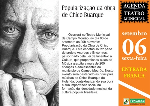 O projeto “Acordes e Encontros” vai fazer uma apresentação especial no Teatro Municipal nesta sexta-feira (20h). Será sobre a popularização da obra de Chico Buarque, com entrada franca. O projeto começou em 2009 com o apoio da Lei Municipal de Incentivo à Cultura – modalidade Fepac - dando aulas de música gratuitas para crianças e adolescentes de várias escolas da cidade. Olha aí, nem só de sertanejo universitário vivo o homem...