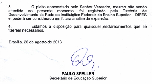 Em oficio assinado no dia 26 de agosto, o secretário de Educação Superior, Paulo Speller, diz que novos cursos demandam estudos de viabilidade.