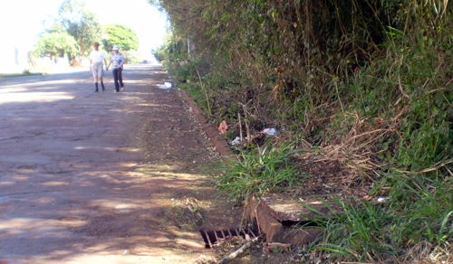 Foto de sexta-feira mostra casal de idosos andando pela rua por falta de calçada. Estão próximos ao Bosque Municipal de Campo Mourão. Fraterno Maria Nunes