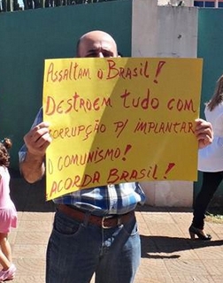 Não faltaram protestos durante o desfile de 7 de Setembro em Campo Mourão. Em geral, eles lembravam um País independente precisa de educação. Mas também teve gente preocupada com a “ameaça comunista”. Esse aí preparou cartaz para alertar que estão querendo implantar o comunismo no País. “Acorda Brasil!”, escreveu.
