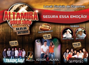 Altamira do Paraná – Vai acontecer de 4 a 6 de outubro, no ginásio de esportes, o Altamira Rodeio Show. A programação inclui shows com as bandas Tradição e Garrafão e com a dupla Edson & Alana, além, é claro, de rodeio. Seguuuuuuuura!...