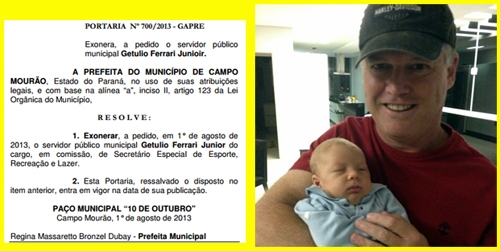 Foi publicada nesta sexta-feira a portaria com o pedido de exoneração do ex-vice-prefeito Getulinho Ferrari da Secretaria de Esportes. Ele ficou 12 anos na prefeitura nas gestões Rubens Bueno e Tauillo Tezelli (93/02), mas desta vez foram só seis meses. No mesmo dia que saiu a portaria, Getulinho postou no Facebook uma foto com o netinho (o primeiro!), que nasceu há pouco mais de um mês. Que Fecam, que nada!...
