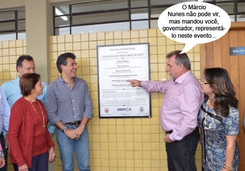 O clic é da inauguração da escola municipal Lucinéia Braciforte, em Ubiratã, semana passada, que teve a presença do governador Beto Richa. Quem aparece apontando para ele é o prefeito Baco Duarte. O ex-prefeito Fábio D’Alécio está ao fundo. O presidente do Ipáguas, Márcio Nunes, que costuma representar Richa na região, não participou. Também, com o governador presente, não precisava, né?...